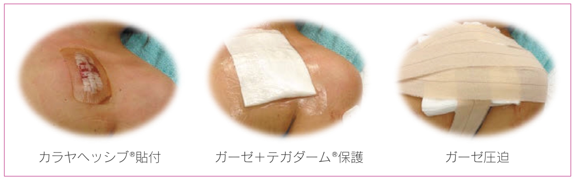 ハイドロゲル創傷被覆材(カラヤヘッシブ)を創部を覆うように貼付し, その上にフィルムドレッシング製剤(テガダーム)を貼付する.