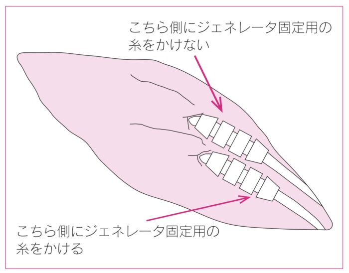固定するときにスリーブ頭側の大胸筋に糸をかけると立位時にジェネレータがスリーブを巻き込むように牽引されてリードが抜けてしまうため, スリーブ尾側の適度に離れた位置に固定の糸をかける.